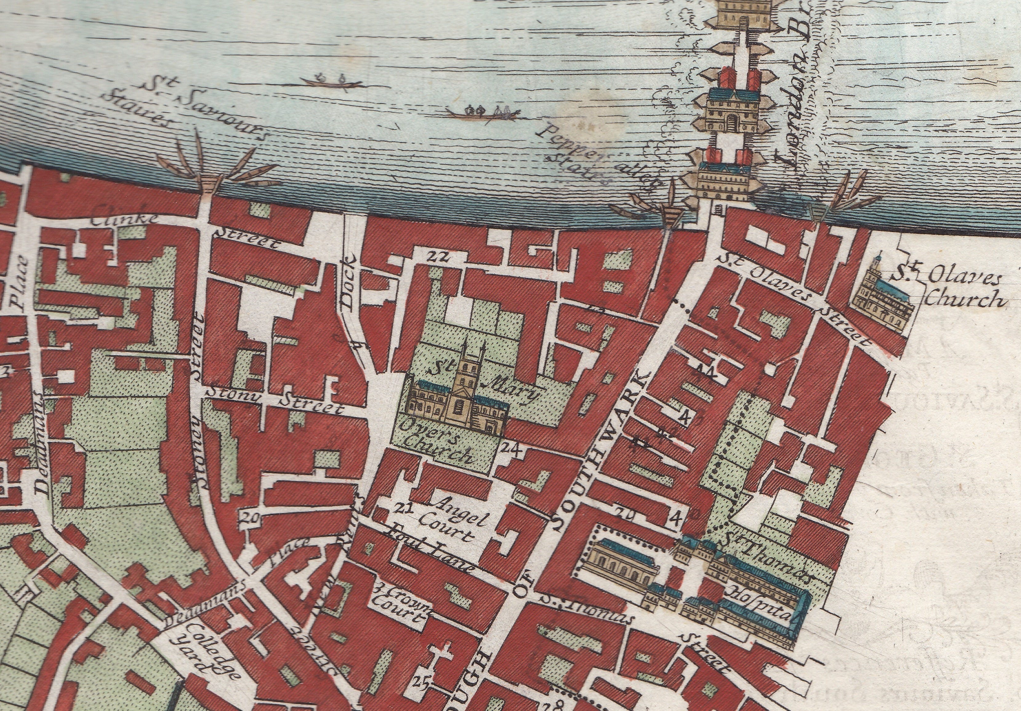 For mediaeval Southwark, however, the High Street was the solid ground around which the Borough grew. Here in 1106, the Augustinians or Austin Canons established the great church of St Mary Overie (or St Mary Overs), thanks to the benefaction of two Norman knights: William Pont de l’Arche and William Dauncey. The nave was soon rebuilt thanks to the generosity of William Giffard, the Bishop of Winchester whose vast diocese sprawled from just west of that city all the way until London’s Bermondsey where Rochester’s diocese began. (North of the river was the domain of the Bishop of London.)